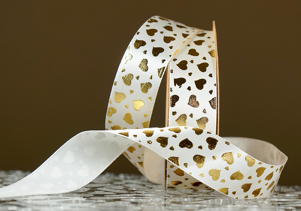 Атласна стрічка з принтом "СЕРЦЕ" молочний (№18425) (2,5 см *18.5 м)