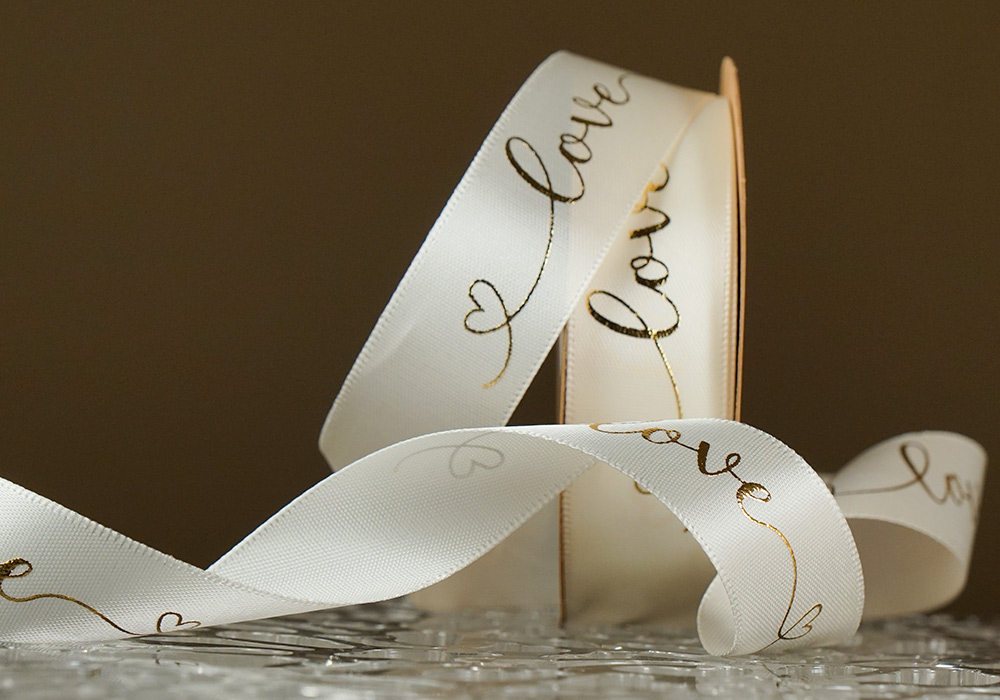 Атласна стрічка з принтом "LOVE" молочний (№18525) (2,5 см *18.5 м)