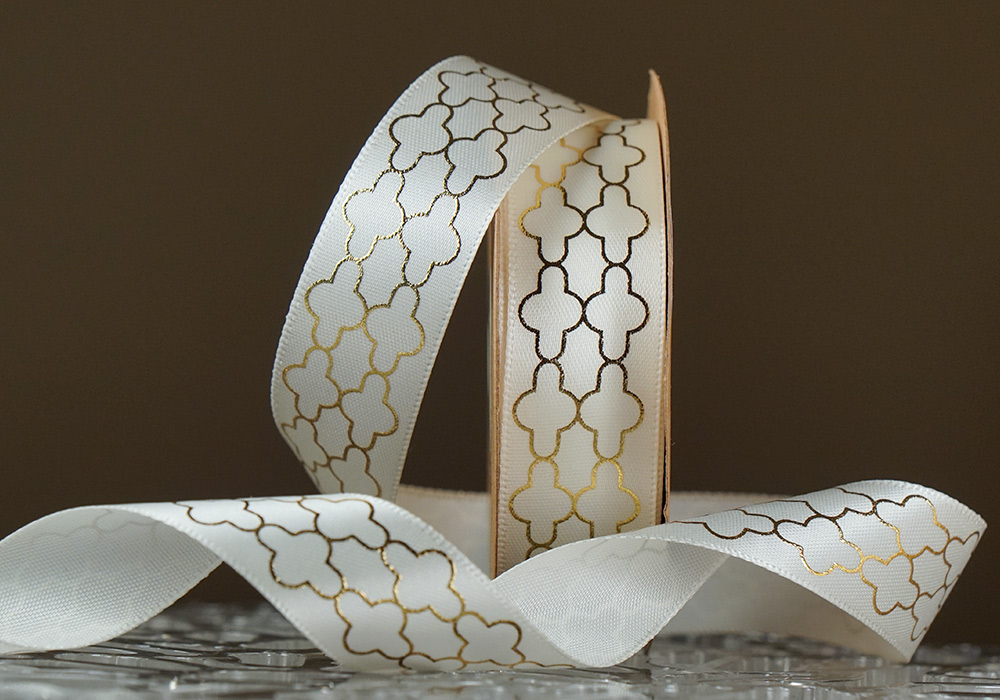 Атласна стрічка з принтом "ОРНАМЕНТ" молочний (№18925) (2,5 см *18.5 м)