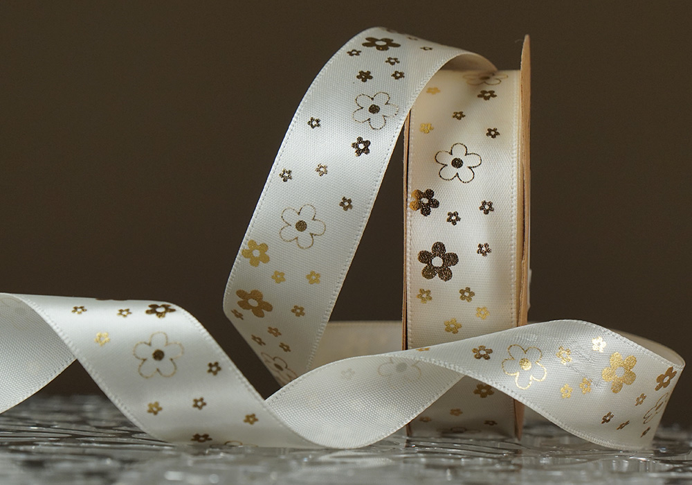 Атласна стрічка з принтом "КВІТИ" молочний (№19025) (2,5 см *18.5 м)