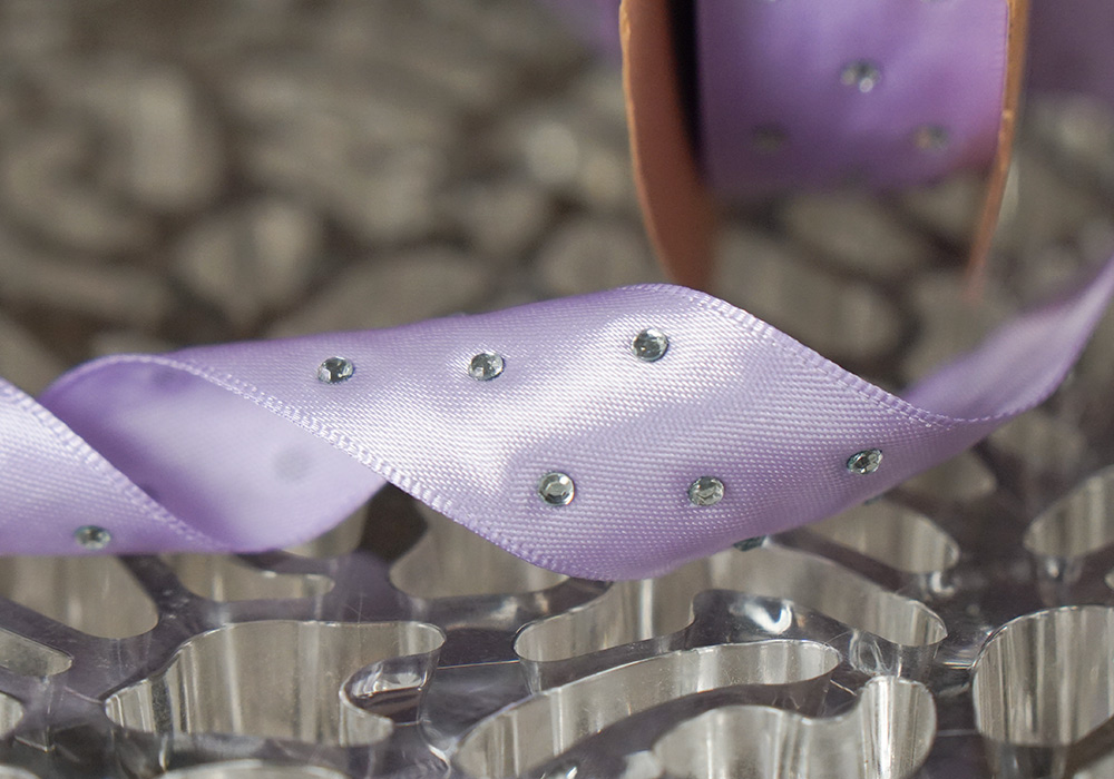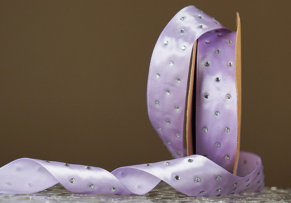 Оптовий склад декоративних стрічок в Україні! Атласна стрічка зі стразами бузковий колір Все для упаковки та рукоділля! пакування подарунків, букетів, тортів, макарунів, макаронс, десертівта святкових смаколиків.