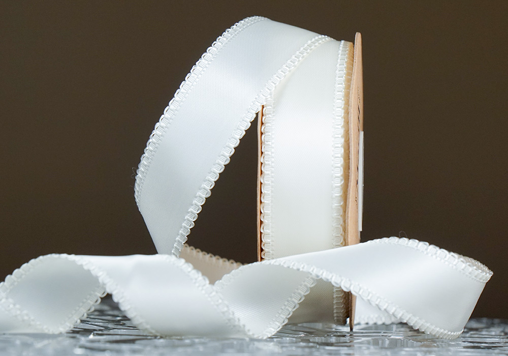 Стрічка двостороння атласна з ажурним кантом (2,5 см *18,5 м), молочний (Ivory) (№000) (1рулон)