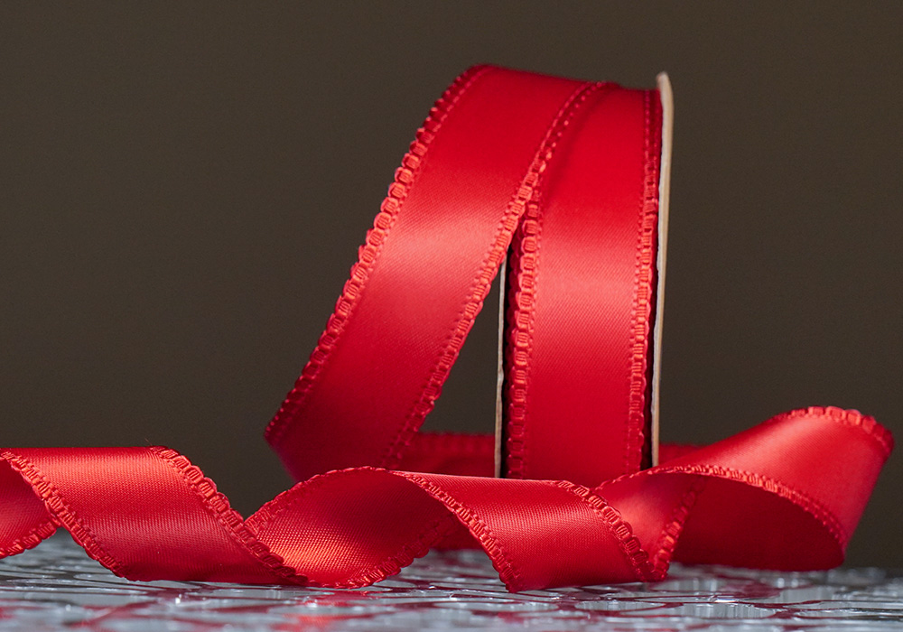 Стрічка двостороння атласна з ажурним кантом (2,5 см *18,5 м), червоний (№250) (1рулон)