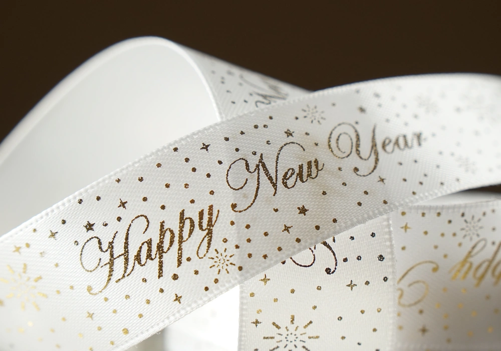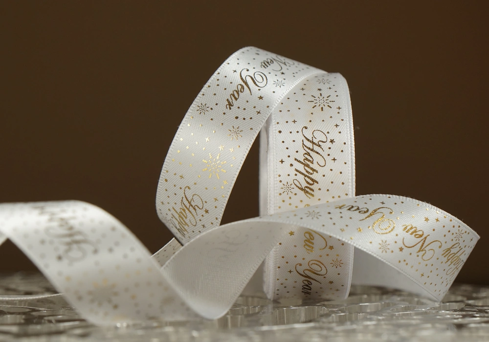 Атласна новорічна стрічка "Happy New Year" з салютом біла (2.5 см *23 м) (1рулон)