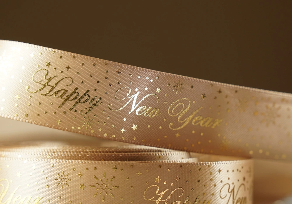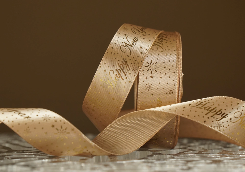 Атласна новорічна стрічка "Happy New Year" з салютом світло-коричневий (2.5 см *23 м) (1рулон)