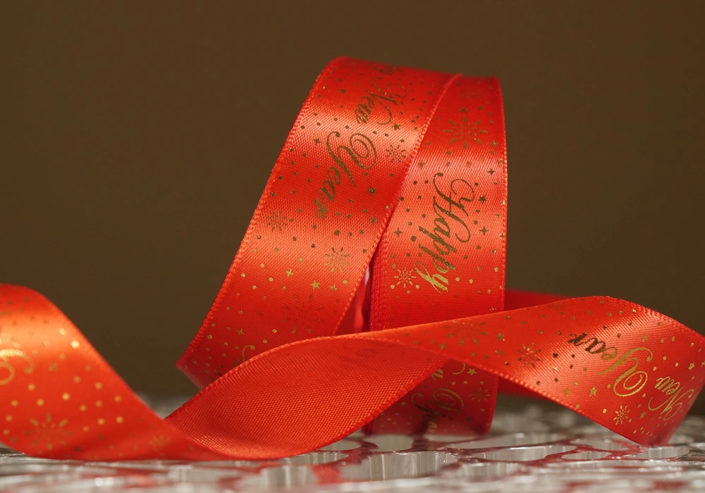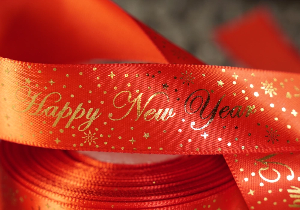 Атласна новорічна стрічка "Happy New Year" з салютом червона (2.5 см *23 м) (1рулон)