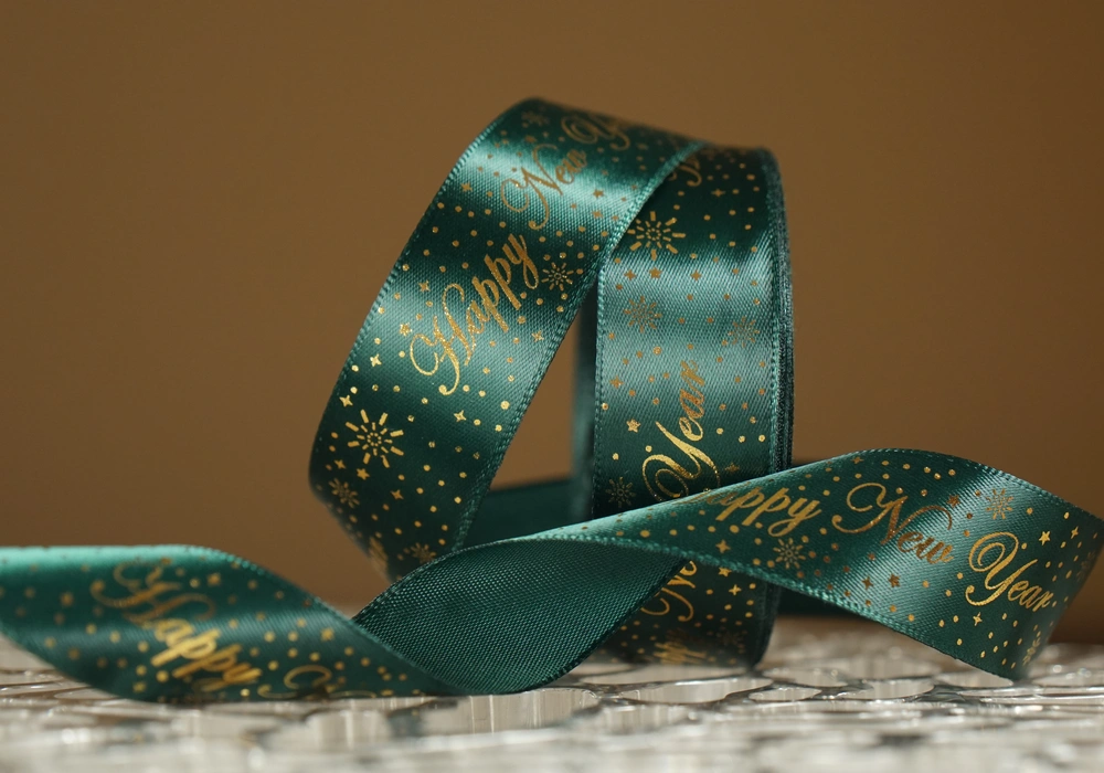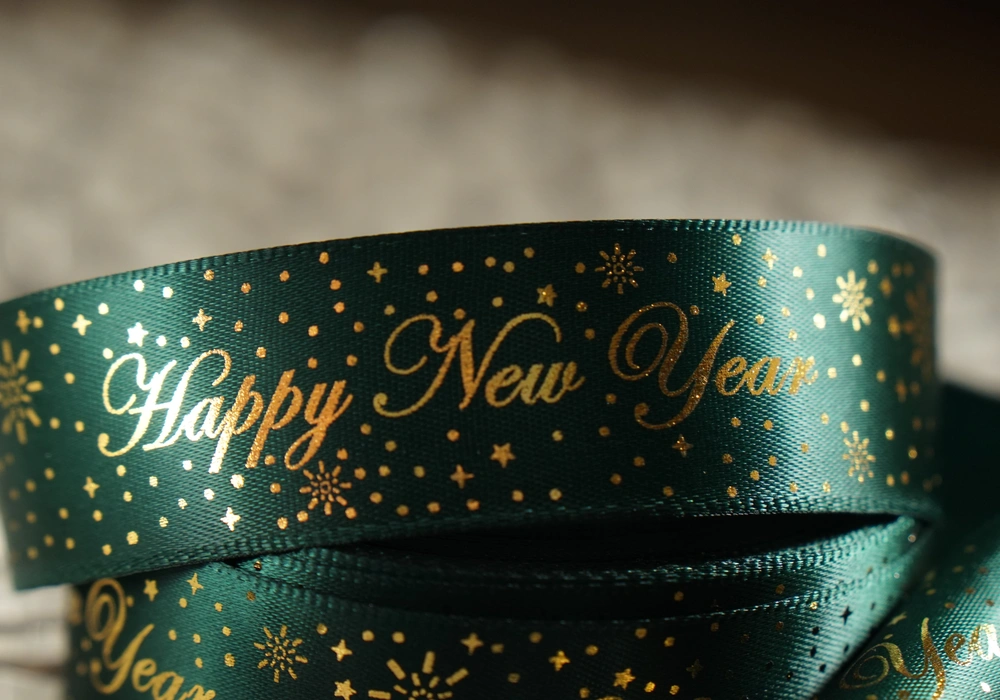 Атласна новорічна стрічка "Happy New Year" з салютом зелена (2.5 см *23 м) (1рулон)