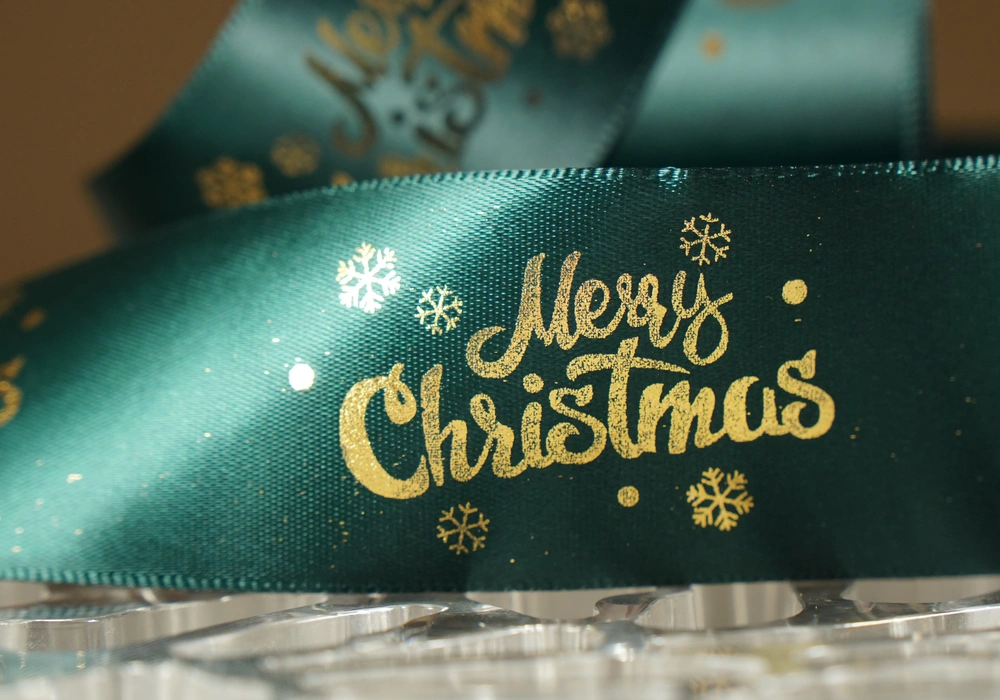 Атласна новорічна стрічка "Merry Christmas" 5 сніжинок зелена (4,0 см *23 м) (1рулон)
