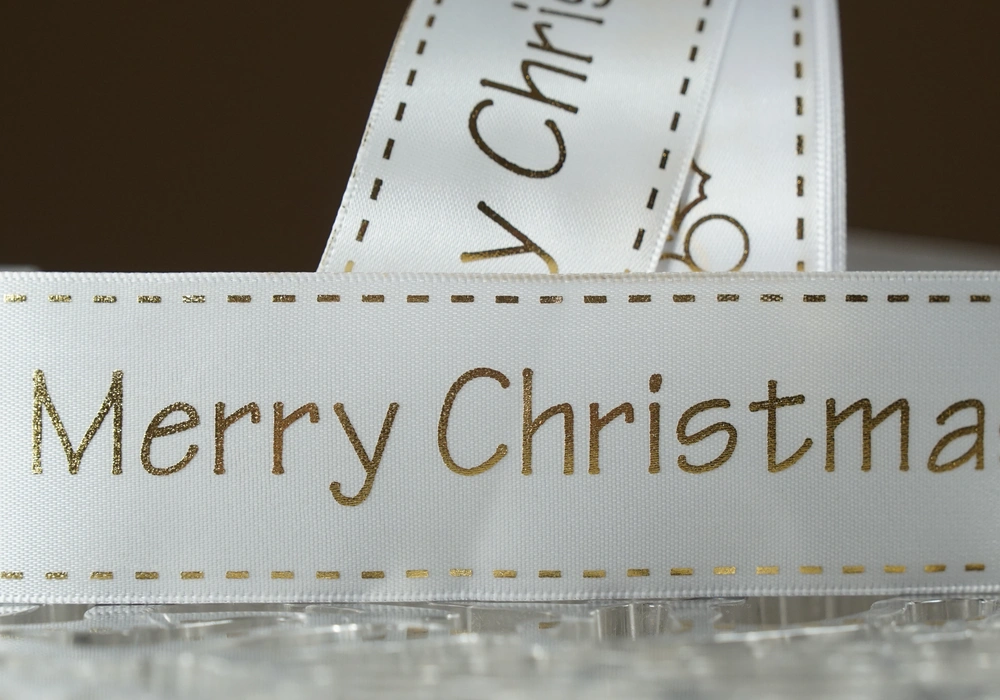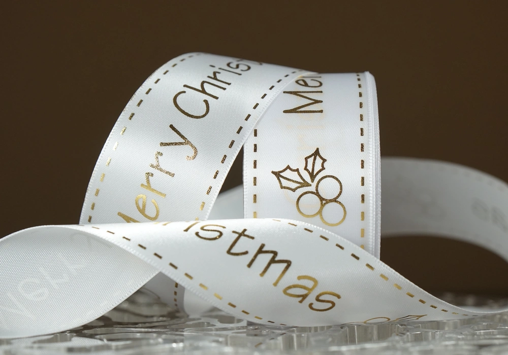 Атласна новорічна стрічка "Merry Christmas" з ягідкою біла (4,0 см *23 м) (1рулон)