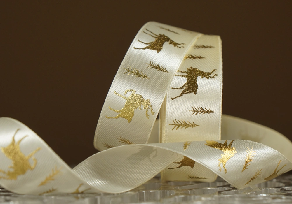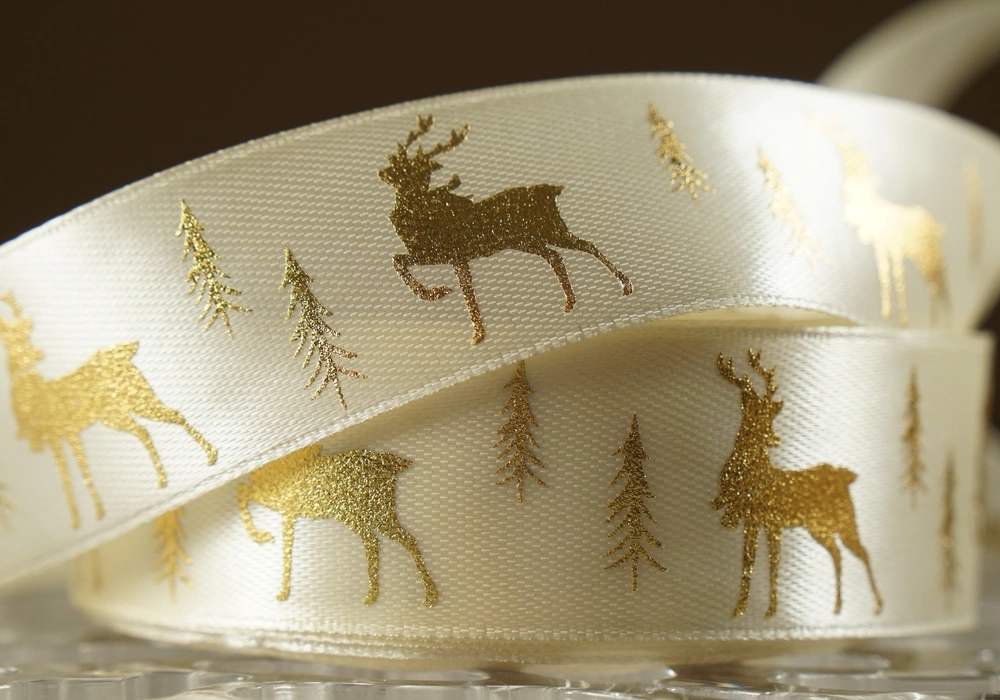 Атласна новорічна стрічка з Оленями та Ялинками молочний (2.5 см *23 м) (1рулон)