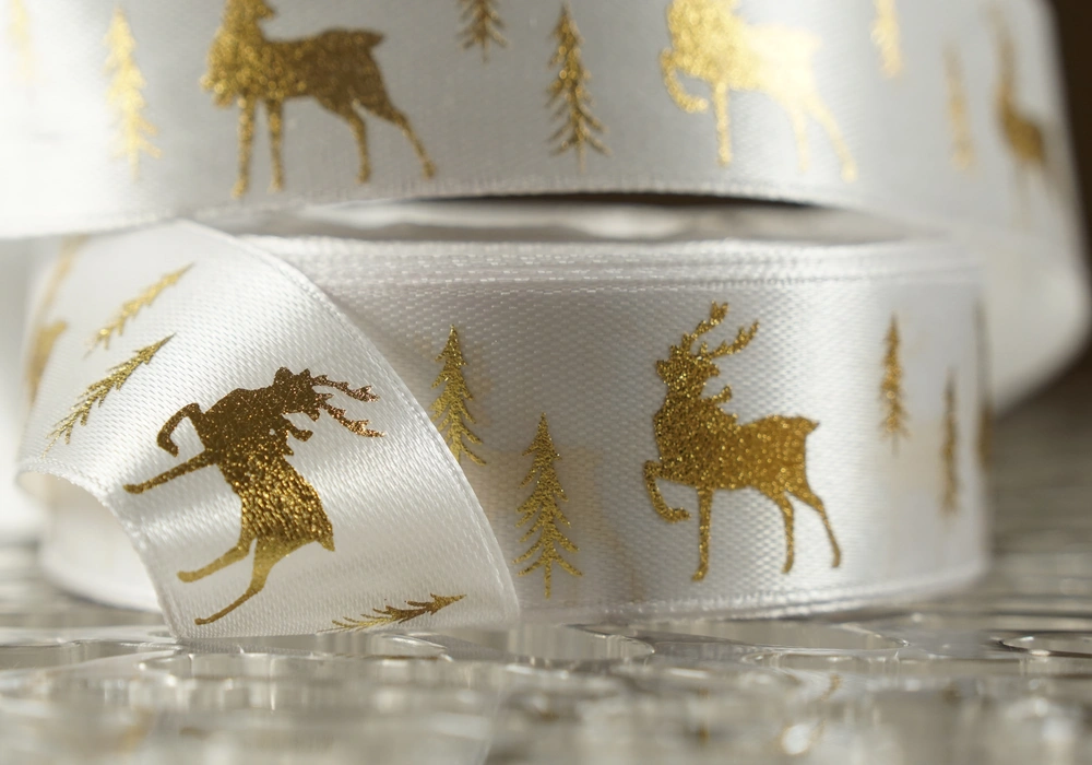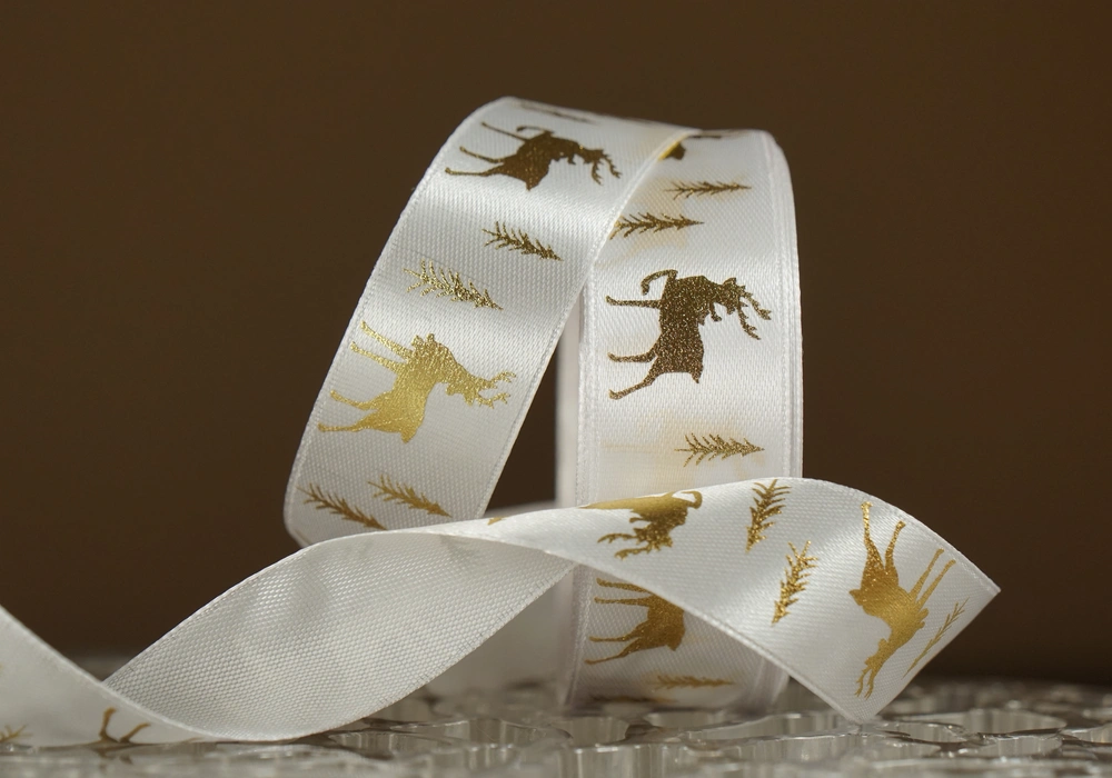 Атласна новорічна стрічка з Оленями та Ялинками біла (2.5 см *23 м) (1рулон)