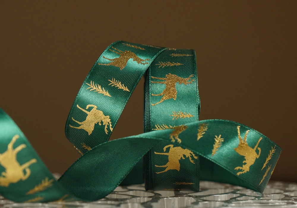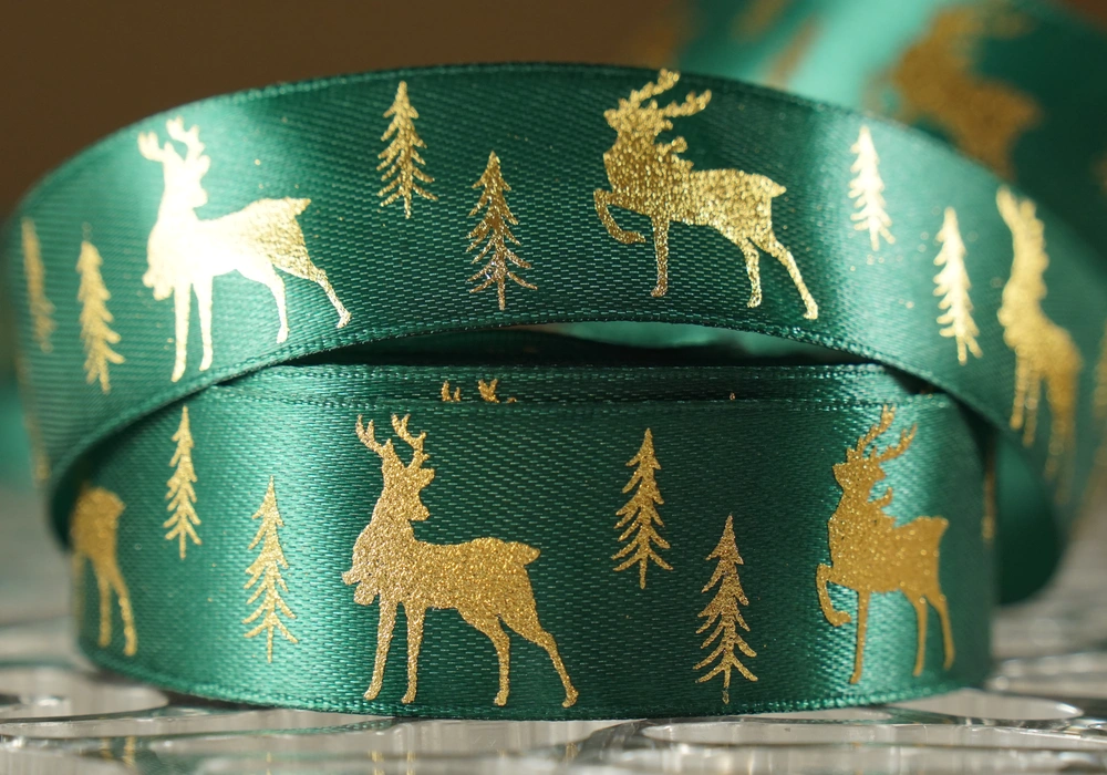 Атласна новорічна стрічка з Оленями та Ялинками зелена (2.5 см *23 м) (1рулон)