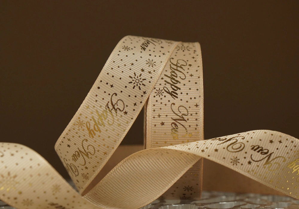 Репсова новорічна стрічка "Happy New Year" з салютом карамельна (2.5 см *23 м) (1рулон)