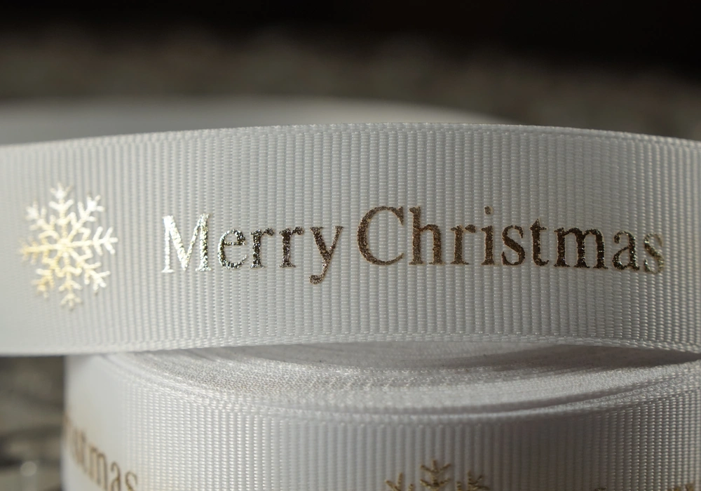 Репсова новорічна стрічка "Merry Christmas" Сніжинка біла (2,5 см *23 м)(1рулон)