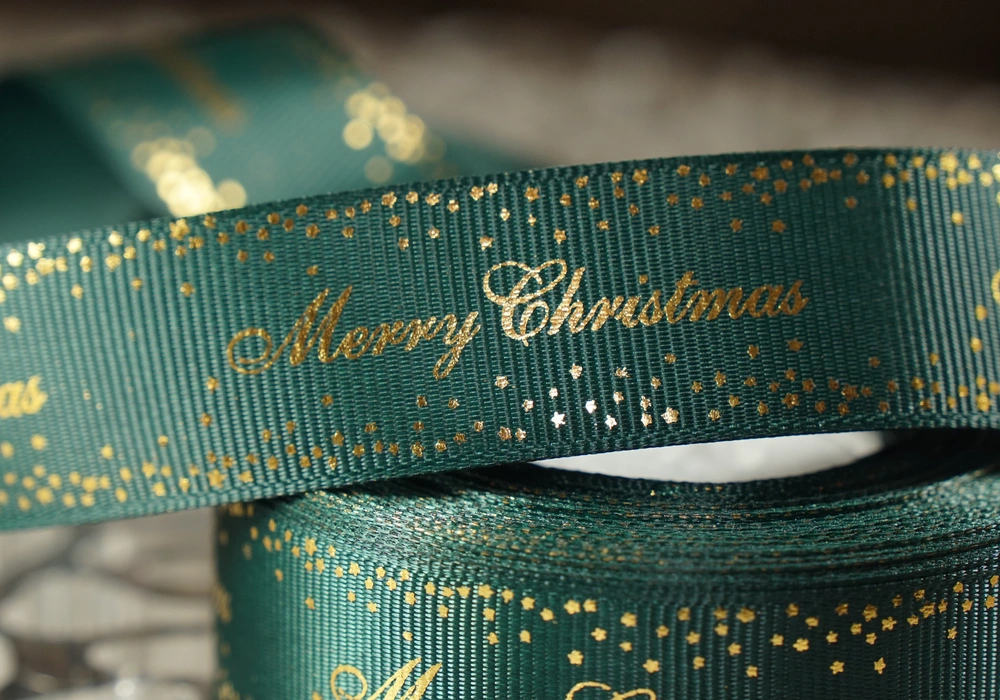 Репсова новорічна стрічка "Merry Christmas" Зірки зелена (2,5 см *23 м)(1рулон)