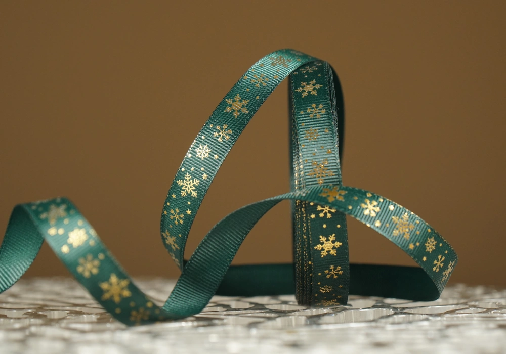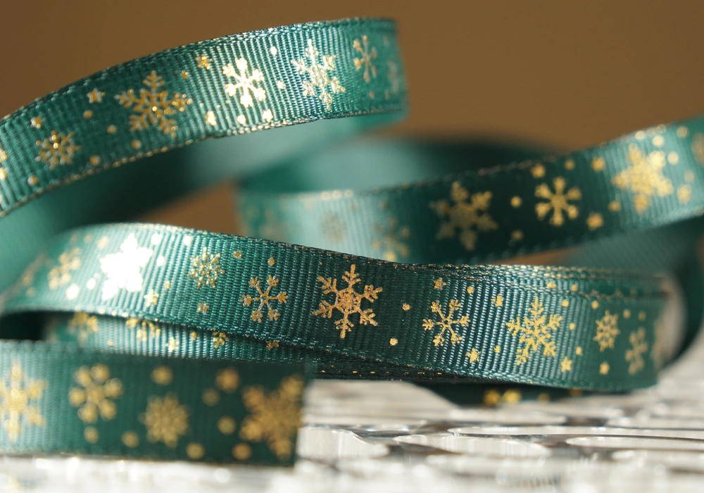 Репсова новорічна стрічка "Сніжинки" зелена (1,2 см *23 м) (1рулон)