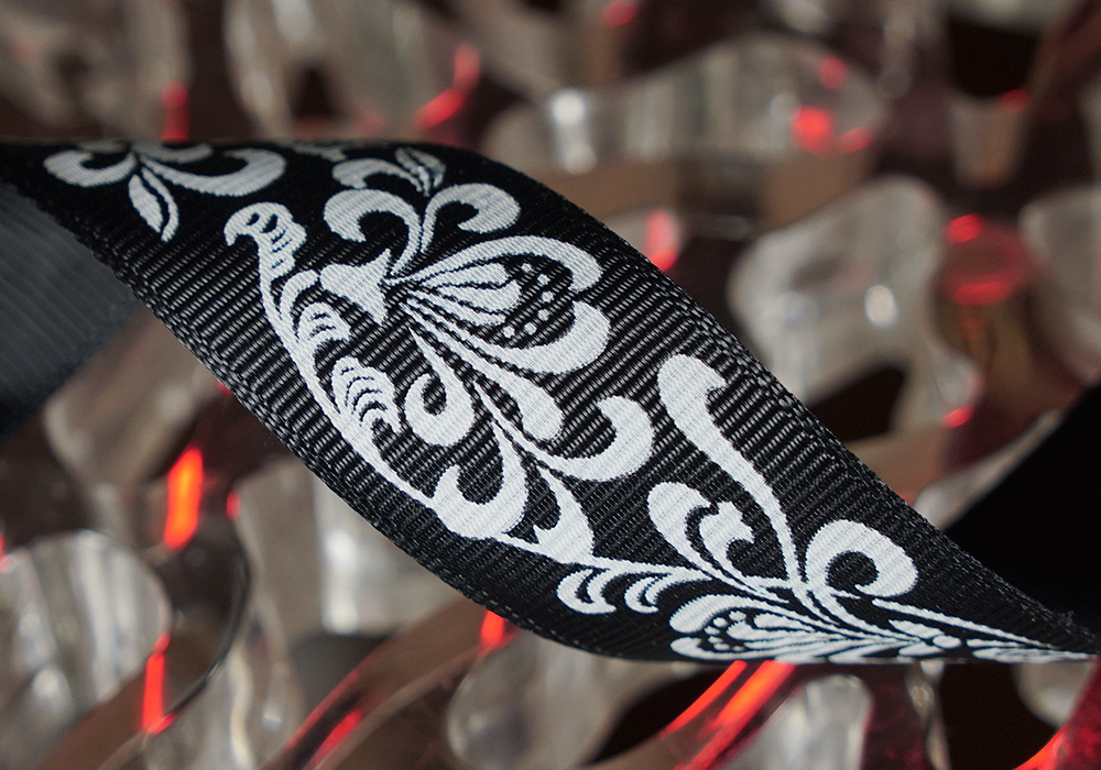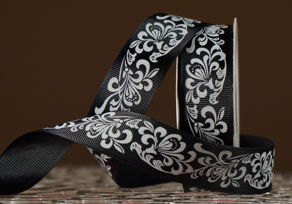 Репсова стрічка з принтом "КВІТИ-3" чорний (2,5 см *23 м) (1 рулон)