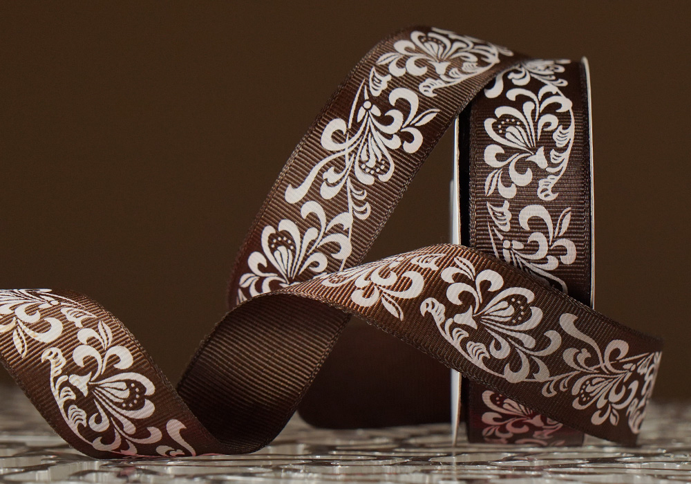 Репсова стрічка з принтом "КВІТИ-3" коричневий (2,5 см *23 м) (1 рулон)