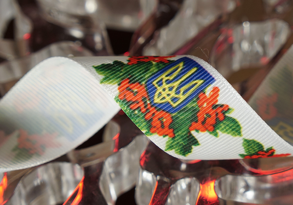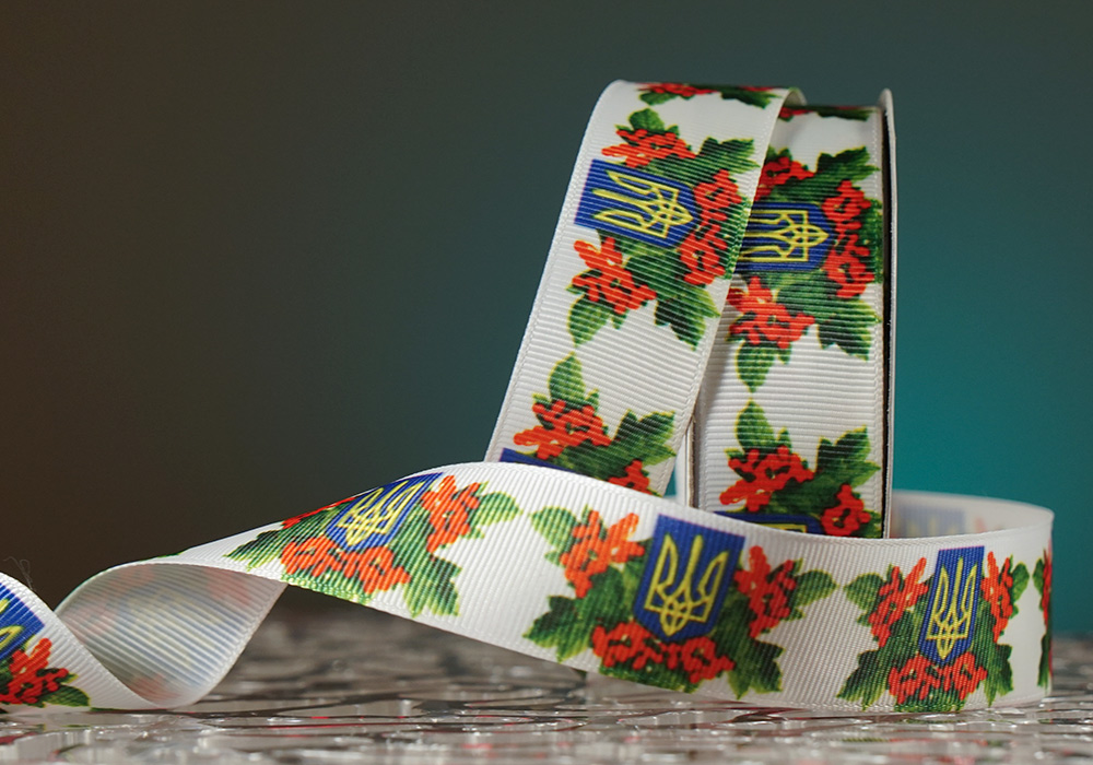 Стрічка репсова Квіти + Герб (Український принт) (2,5 см *23 м) (1 рулон)